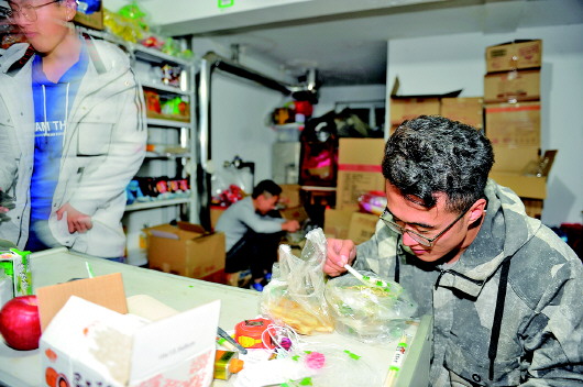 11月7日6点左右,夜幕降临,在济南长清区大学城附近一小区的车库里灯火通明,张鑫正和其他配送员一起忙着分拣商品,不一会儿,地上就摆满了装有零食的大大小小的塑料袋,这是当晚周边大学生下的单,张鑫粗略算了一下,有130多单,估计又要送到晚上11点多了。