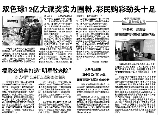 泰安市福彩中心副主任刘进代表泰安福彩向彭集敬老院捐赠了棉被、面粉、花生油等慰问品。还特意为敬老院12月份过生日的老人准备了精美的生日蛋糕。 (陈梅君 杨启亮)