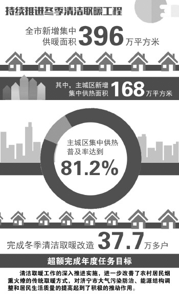 这个冬天,任城区唐口街道张桥村的村民们告别了土暖,通过气代煤改造,家家户户用上了天然气取暖……2019年,济宁市集中供热总面积达到1.07亿平方米,新增集中供热面积396万平方米。其中37.7万多户居民告别了烟熏火燎的取暖方式,完成了清洁取暖改造。