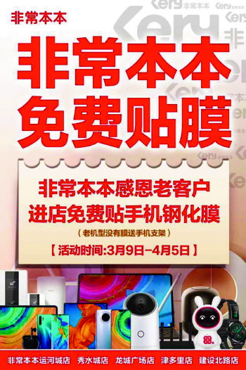 从3月5日起,非常本本就开始全面复工,包括运河城富一楼旗舰店、一楼精品店,以及非常本本秀水城店、龙城广场店、津多里店和建设北路店,全面复工营业。为了感恩老客户,非常本本推出了进店“送19.9元钢化膜免费贴”活动,吸引顾客。