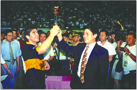 1996年,马拉多纳代表博卡青年来华进行比赛,并获得奖杯。
