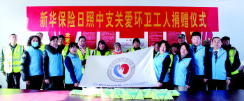 12月15日上午,新华保险日照中支一行志愿者,来到东港区西湖镇环卫处开展公益活动,向环卫工人捐赠100件反光马甲,为环卫工人献爱心送温暖。