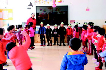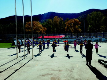 沂源县悦庄镇中心幼儿园开展趣味晨练活动。(由刘金凤、巩进勇提供)