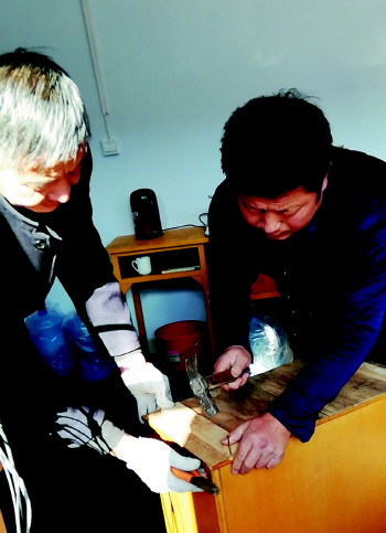 沂源县三岔中心学校老教师认真完成日常维修工作。