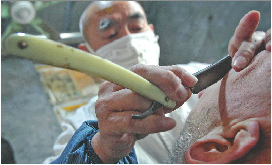 “三年的剪子,五年的刀”。当年为了学习剃头,老任苦练基本功,“骑马蹲”一练就是半小时,接水、扫地、洗毛巾的杂活干了一年,才获得师傅批准拿刀。学会剃头只是刚入门,用刀刮胡子刮脸才是高难度。老任根据顾客胡茬软硬不同,用毛巾热敷一到两遍后打上泡沫,锋利的刮刀在顾客脸上游走。几十年经验变化成各种手法,在这一刻体现得淋漓尽致。十分钟,顾客满脸的胡茬和角质已被刮得一干二净,连耳朵和眼角这种脆弱敏感部位都干干净净。手艺的精湛离不开工具的配合,铸铁的理发椅用了50多年,胶木梳子和刮刀至少20年未换,一条牛皮“荡片”从学徒时就一直带在身边,至今用了49年。