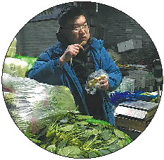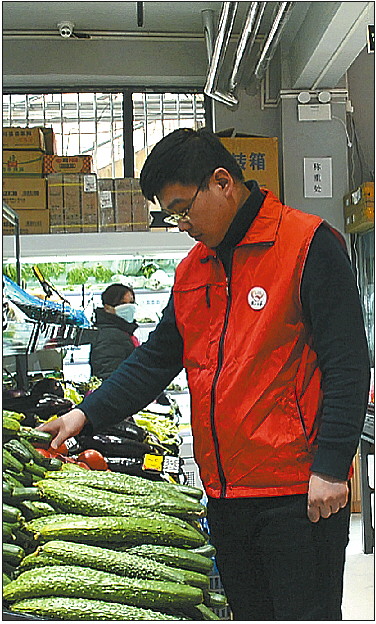 上图:丁翊龙在新开张的超市里查看蔬菜。