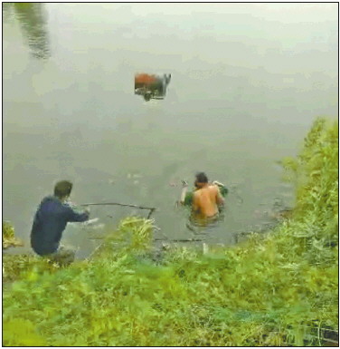 出事的是车主程刚一家。据程刚说,26日上午,他和妻子儿子一家三口驾驶越野车出去玩,因为路况不熟,途经辛宅子水库路段时,误入水库附近,车打滑陷入水中,等他反应过来时,车已经全被被水淹了,落入深水区。“我和儿子会游泳,但我爱人不会游泳。儿子在车里将车门打开,救出了妈妈,幸好车边上就有两个捆在一起的油桶,儿子就和妈妈抱着油桶等待救援。”