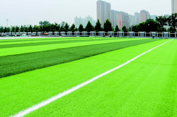 刚铺设完毕的人工草皮。