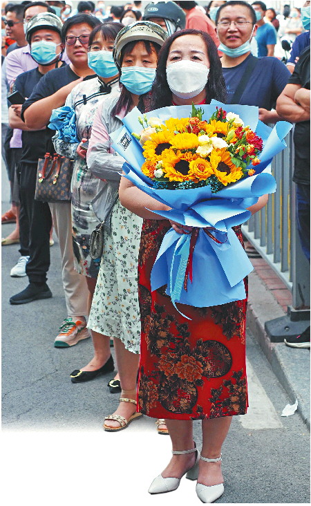 右图:7日下午,首日考试即将结束,家长守候在考场外。 记者 周青先 摄