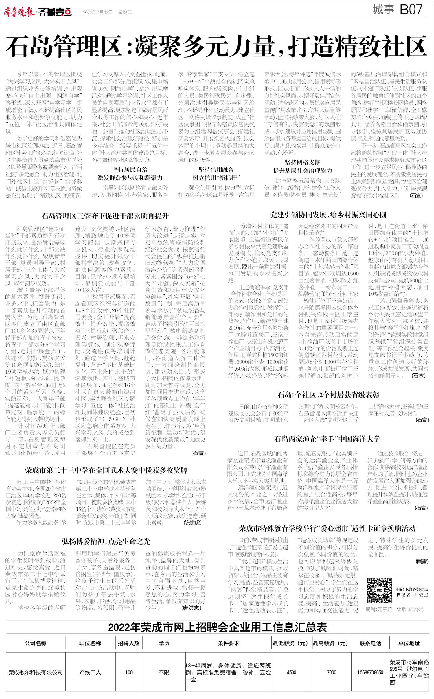 下一步,石岛管理区社会工作部将继续按照“五位一体”社区治理共同体建设要求抓好城市社区工作,进一步立足民生,倡导协商民主的发展理念,不断激发居民的主体意识和创造意识,为社区治理凝聚合力、注入活力,打造居民满意的“精致幸福社区”。 (石宣)