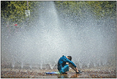 7月26日,在美国俄勒冈州波特兰,一名男子坐在喷泉旁。 新华/美联