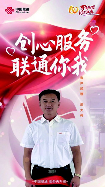 他还积极结合地方特点,不断尝试“数字乡村”平台在本地的应用,完成多个村庄整体转网和数字化平台管理,厉大伟经理始终真心实意为客户着想,本着为用户节约、从用户的需要出发,认真听取用户需求,了解用户网络等实际情况,针对用户反映的问题给予认真解答,给用户算明白账,用最小的付出,换取最大的效益,为用户提供优质服务;用心发现和及时了解客户的需求,真心实意和客户沟通,及时解决客户急需的问题,厉大伟经理真正做到了“用心联通 网络天下”,在平凡的工作岗位上不断谱写新的篇章。