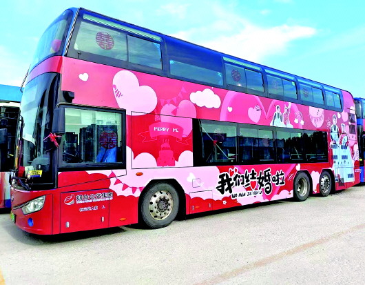 烟台公交的浪漫不止于此。今年五月份,烟台首台婚礼主题双层巴士亮相滨海路,被市民拍摄转发,在社交媒体上获得百万级浏览量,这种体现仙境浪漫又富有创意,还绿色环保的婚车出行方式深受网友喜爱。这是公交集团在本市范围内首创的公交巴士婚礼业务,引领了绿色、节约的婚礼新风尚。