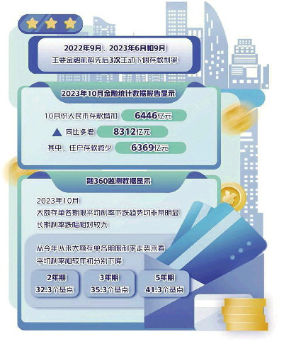 中国人民银行发布的2023年10月金融统计数据报告显示,10月份人民币存款增加6446亿元,同比多增8312亿元。其中,住户存款减少6369亿元。