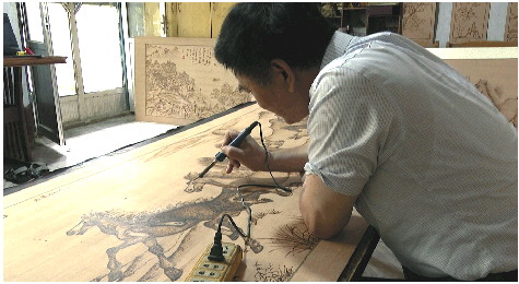 梅氏烙画第五代传承人梅庆国在作画。