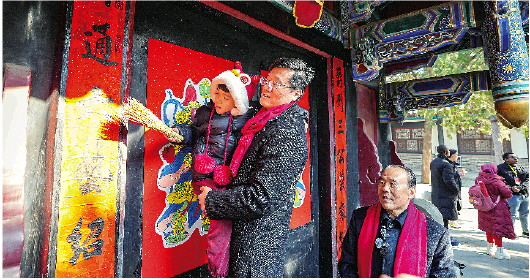 重光门前,只见孔令绍郑重地接过刚刚书写好的孔府春联和新拓制的孔府门神,用毛刷蘸糨糊斜斜地一刷,再将对联及门神一一递给孔颖,孔颖站在木凳上,小心翼翼地将其贴至重光门上,接着抱起儿子孔齐维翰,一起手拿黍子笤帚在对联及门神上轻轻扫抹拍打……祖孙三代在现场演绎的孔府春联和门神的张贴程序,也瞬间吸引了众多现场游客的眼球。