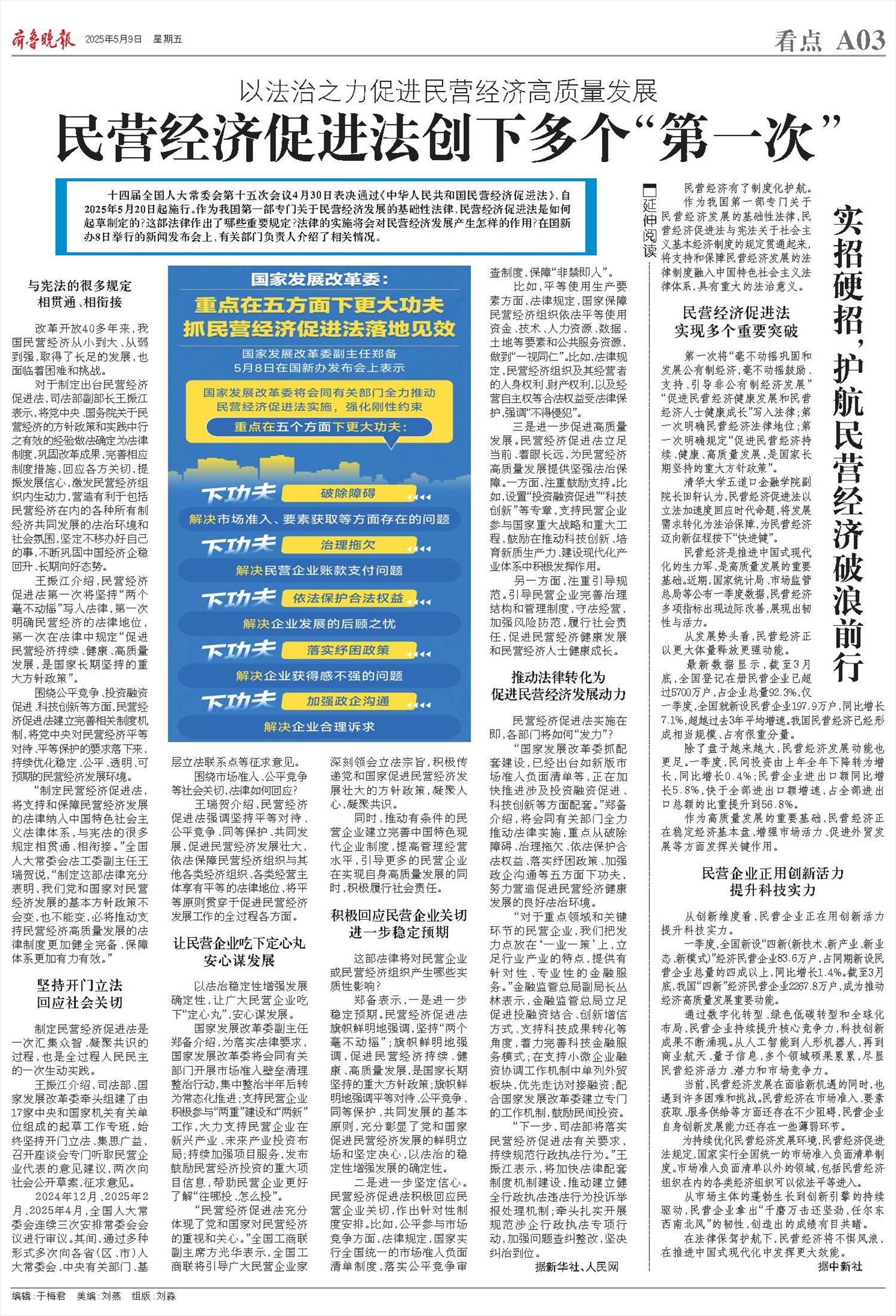 “国家发展改革委抓配套建设,已经出台如新版市场准入负面清单等,正在加快推进涉及投资融资促进、科技创新等方面配套。”郑备介绍,将会同有关部门全力推动法律实施,重点从破除障碍、治理拖欠、依法保护合法权益、落实纾困政策、加强政企沟通等五方面下功夫,努力营造促进民营经济健康发展的良好法治环境。