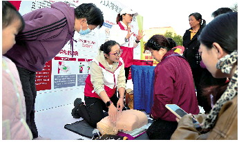 在讲师的指导下学习心肺复苏急救法。