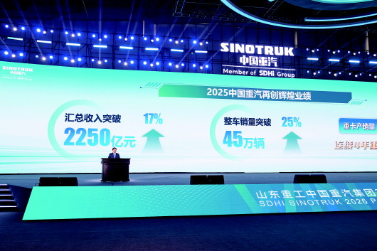 展望2026年,中国重汽将与各位合作伙伴共担目标、共拓市场、共享成果,携手实现产品、渠道、政策、品牌、服务、生态等全链条共赢,全力冲击国内整车销售34万辆目标,以更加紧密、更富韧性的“命运共同体”,为奋战“十五五”新征程筑牢坚实根基,为中国重汽跨越百年、全速迈向世界一流凝聚合力,共同开创中国商用车行业高质量发展更加美好的未来! (吴海云)