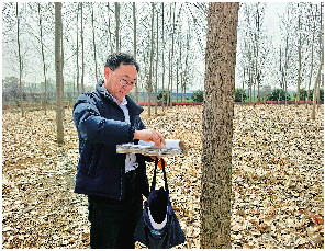 王雷查看试验田杂交杨树生长情况。 受访者供图