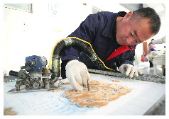 工人正在处理地毯上的纹样。