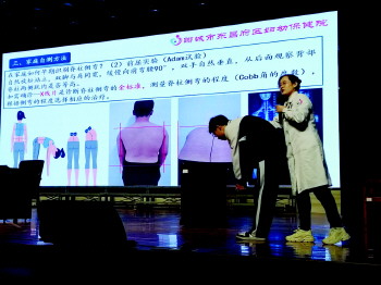 为让科普知识更加直观易懂、入脑入心,朱龙云主任现场邀请学生上台,开展面对面、手把手的直观教学。通过示范标准坐姿、站姿,演示脊柱自查方法,现场纠正不良体态,用生动鲜活的互动形式,让在场师生清晰掌握科学护脊要点,将专业医学知识转化为可操作、易践行的日常习惯,赢得了现场阵阵掌声。