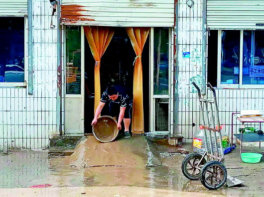 ▲14日一早,在章丘开面馆的陕西人宋光辉在水退后重返面馆,用脸盆往外清理泥水,准备重新开业。 齐鲁晚报·齐鲁壹点记者 支倩倩 摄