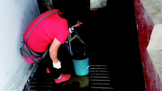 8月13日,小区业主正向外清理地下室内积水。   齐鲁晚报·齐鲁壹点记者 黄祖滨 摄