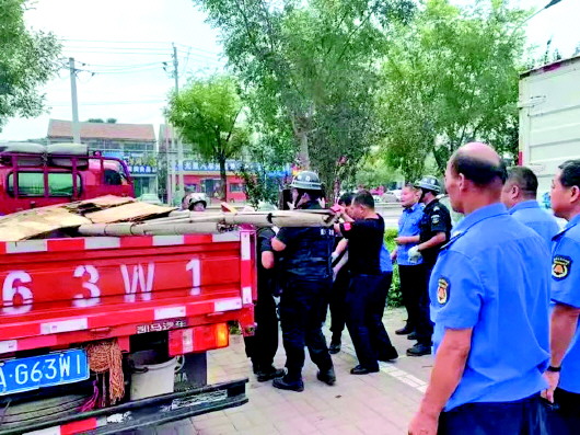 城管人员清理违规设置的杂物。