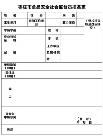 符合招聘条件并志愿参加此项义务工作的人士,请登录枣庄市市场监管局官网(http://scjg.zaozhuang.gov.cn/zwgk/)下载《枣庄市食品安全社会监督员报名表》,填写相关内容后,发送电子邮件到邮箱bgs3318378@163.com进行网上报名,也可在工作日到枣庄市食品安全委员会办公室(地址:枣庄市市府西路新城嘉陵江路77号枣庄市市场监督管理局625室),领取报名表现场报名。经初审合格后,再根据通知要求携带有关证件进行身份确认。