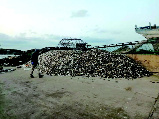 在大连獐子岛镇的东獐子渔港,死亡的扇贝堆积如山。