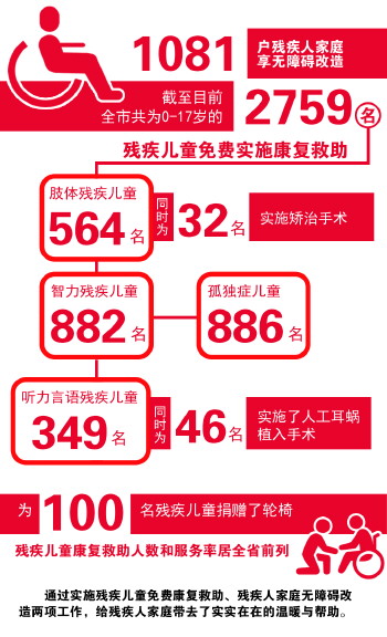 截至目前,全市共为0-17岁的2759名残疾儿童免费实施康复救助,其中肢体残疾儿童564名、智力残疾儿童882名、孤独症儿童886名,听力言语残疾儿童349名;为46名听力残疾儿童实施了人工耳蜗植入手术,为32名肢体残疾儿童实施矫治手术,为100名残疾儿童捐赠了轮椅,残疾儿童康复救助人数和服务率居全省前列。