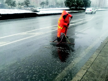 一名环卫工正在铲除雪水。 本报记者 丛书莹 摄