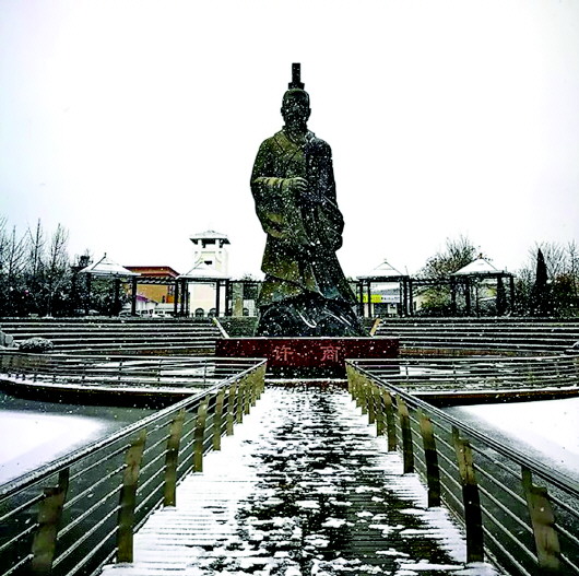 雪后的许商塑像更显庄重。 冯培刚 摄