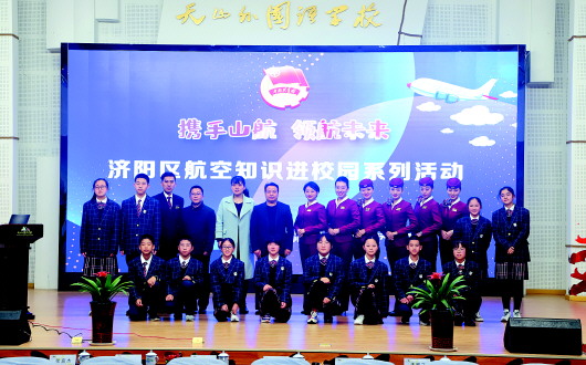 新年伊始,山航客舱服务部济南大队四中队团支部联合共青团济南市济阳区委开展的“携手山航,领航未来”航空知识进校园系列活动第二场在济南市天山外国语学校成功举行,全校600余名师生共同参加了活动。济阳团区委副书记为山航客舱部济南大队四中队团支部授旗,标志着济阳区“繁星计划”航空知识宣讲团的正式成立。(于鹏飞 任玥)