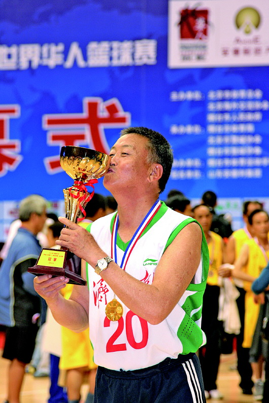2019年6月份,在广东举办的全国中老年篮球比赛中,济南元老篮球队再次取得冠军,牛兆衍兴奋地亲吻奖杯。