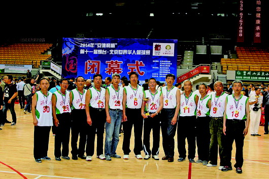 2014年,济南元老篮球队第一次夺得全国冠军,牛兆衍在中间捧着奖杯。