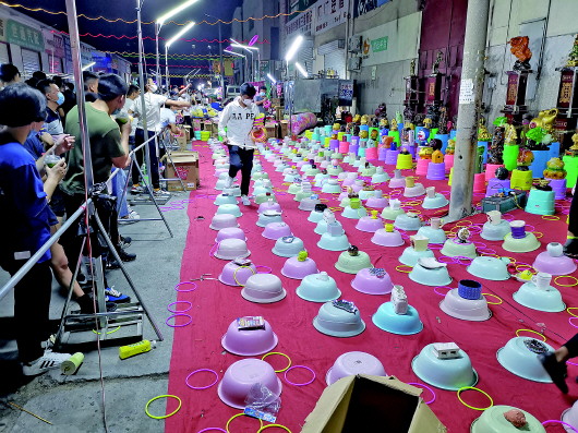 5月2日晚上8点,济南历城区祝舜路,此时正是环联夜市人气最高的时候,李艳梅的套圈摊位前围满顾客,从五岁的孩子到二三十岁的年轻人,在欢呼声和叫喊声中,五颜六色的塑料圈飞来飞去,李艳梅一边一遍遍地蹲下身捡拾掉落的套圈,一边招徕着顾客。