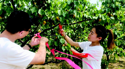 一对情侣在认领的杏树上系上了“杏福”彩带。