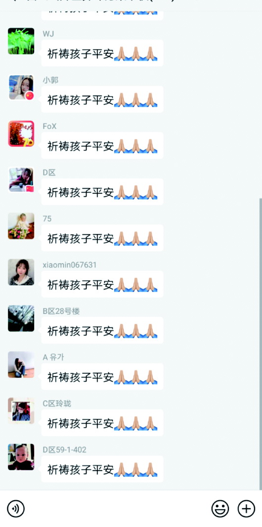 事故发生后,得知消息的青特小镇上千名业主的微信群瞬间就炸开了锅,大家纷纷为这对母女的不幸感到惋惜和同情。当晚,业主们就在微信群中上演了一场爱心接力。一部分业主通过朋友圈、小区现场走访等形式开启紧急寻人模式。“母女俩出了这样的事情,无法明确身份,必须第一时间联系到家属妥善处理。”另一部分业主自发在朋友圈启动爱心款捐助,同时还有不少业主组队驾车前往医院,试图在没有联系到伤者家属的情况下,前往帮助缴费陪护。“这个夜晚出了这样的事故是悲惨的,但我看到邻居们抱成一团,把别人的孩子当成自己的孩子一样关心时,我无不感动到落泪。”一名业主说。