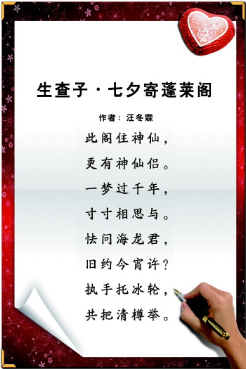 中国自古有借景抒情的手法,面对美景,诗词作为一种抒发情感的载体,表达起来更唯美,也更细腻。为了助力“海誓山盟·遇见蓬莱阁”七夕情话大赛,作为第四届“诗词中国”传统诗词创作大赛二等奖得主、首届(2019)“山东优秀诗人”,汪冬霖专门填词《生查子·七夕寄蓬莱阁》一首,预祝大赛圆满成功。同时,鼓励夫妻恋人,在七夕这个传统情人节,勇敢为爱发声表白。