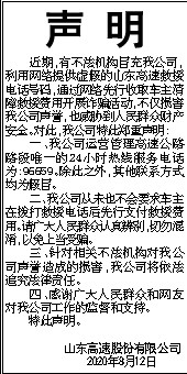 近期,有不法机构冒充我公司,利用网络提供虚假的山东高速救援电话号码,通过网络先行收取车主清障救援费用开展诈骗活动,不仅损害我公司声誉,也威胁到人民群众财产安全。对此,我公司特此郑重声明: