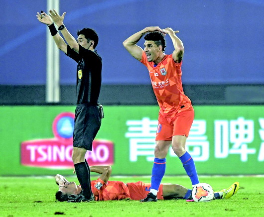 莫伊塞斯(右)在比赛中呼喊队医进场为队友郑铮(下)治疗。 新华社发
