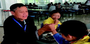 沂源县三岔中心学校总务处老教师房现军和学生用餐后,进行“掰手腕”比赛。