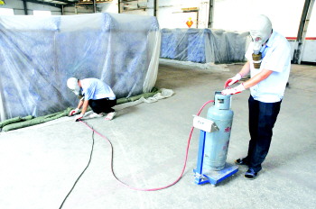 “今天老天爷给面子,只有32℃。”看过手机里的天气预报,队员贾新峰开心地说,天给面子,他们工作环境可是不给面子,他们“与毒为伴”,因为熏蒸农产品使用的溴甲烷属于危化品,一旦泄漏,将给人体带来严重的损伤,所以防护做得非常密实。