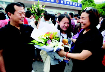 一对父母为走出考场的女儿送上鲜花。 本报记者 马辉 摄