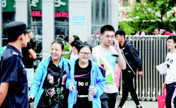 考试结束,两位考生乐呵呵。本报记者 李岩松 摄