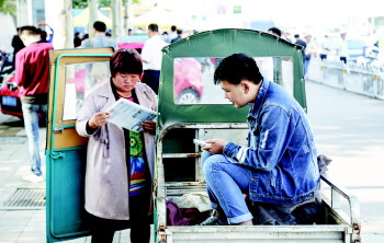一考生坐在三轮车上背题目。本报记者 李岩松 摄