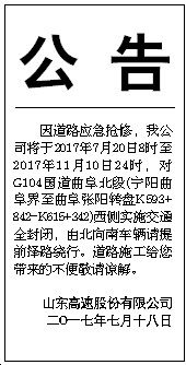 公 告 因道路应急抢修,我公司将于2017年7月20日8时至2017年11月10日24时,对G104国道曲阜北段(宁阳曲阜界至曲阜张阳转盘K593+842-K615+342)西侧实施交通全封闭,由北向南车辆请提前择路绕行。道路施工给您带来的不便敬请谅解。 山东高速股份有限公司 二O一七年七月十八日