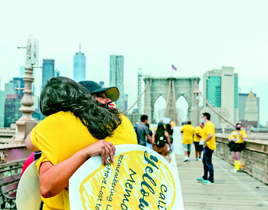 8月7日,参加纪念新冠逝者游行的人们在美国纽约布鲁克林大桥上相互拥抱。 新华/美联